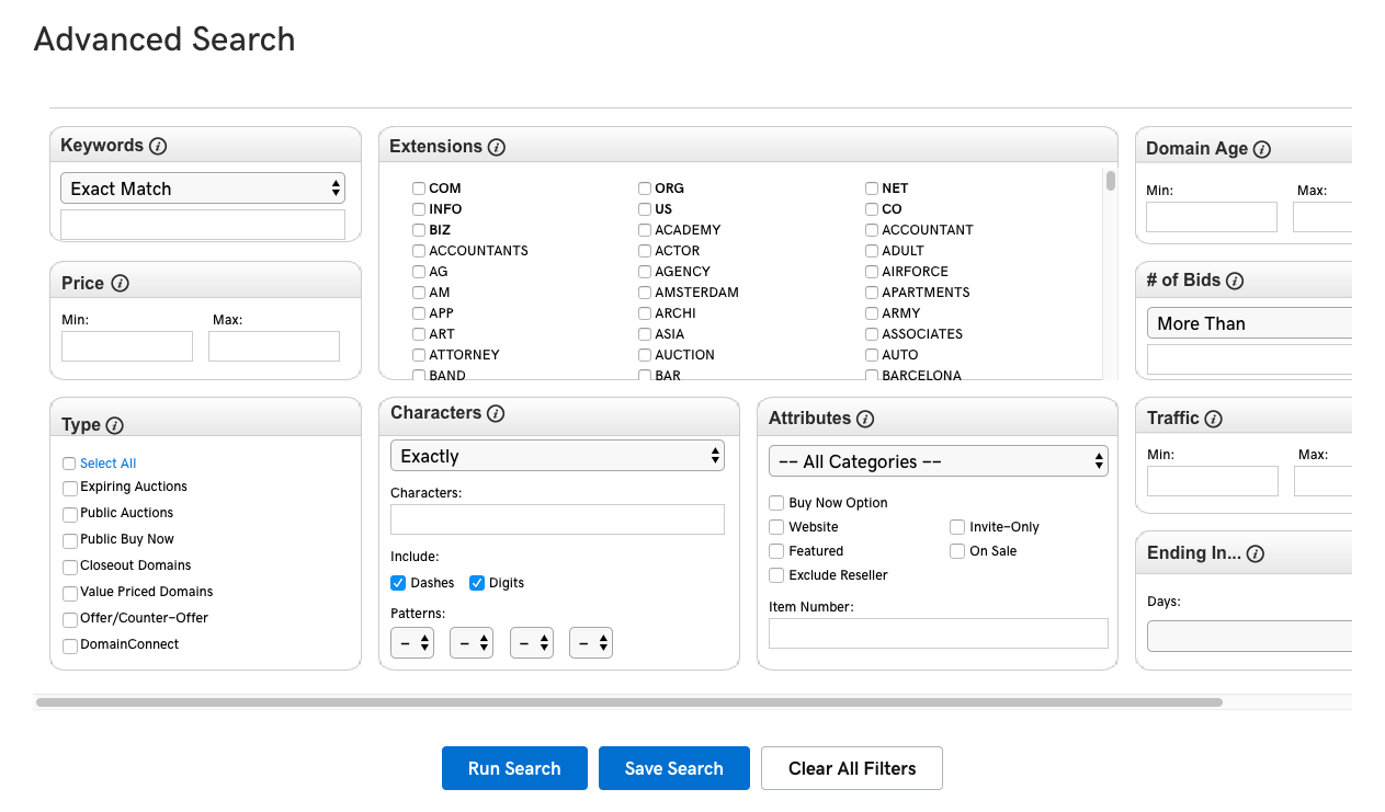- Characters – Filter domain auction inventory by domain length, dashes and/or digits, and character pattern;