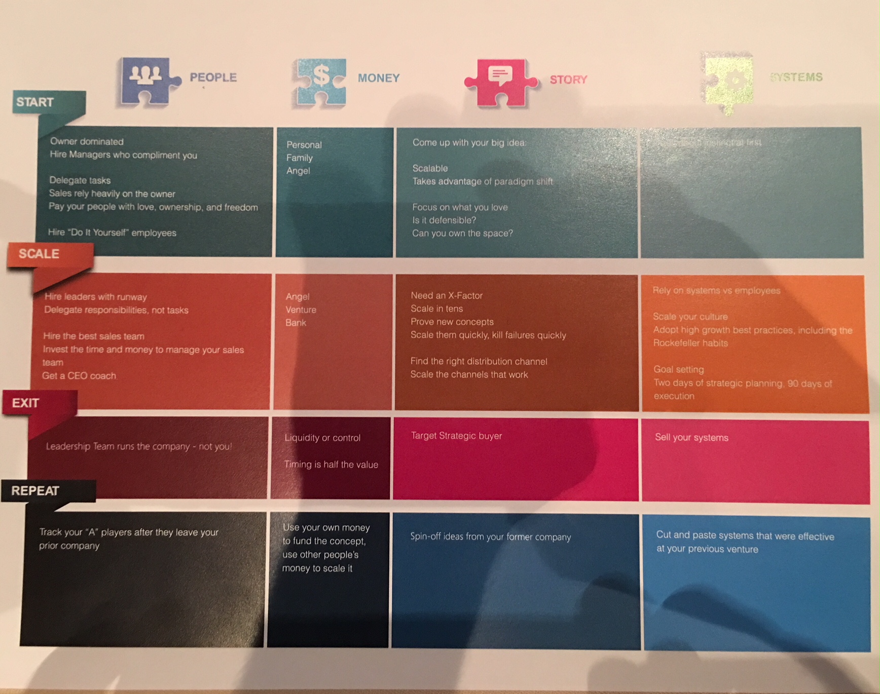 Colin graciously provided a considerations matrix as a guideline for what entrepreneurs should expect and anticipate through each phase of a startup business (sorry for the image shadow).